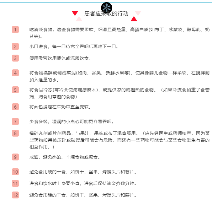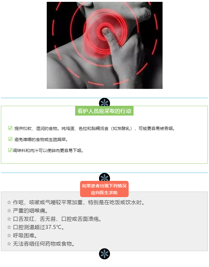 吞咽困難是指患者無(wú)法將食物或水通過(guò)咽喉下送。當(dāng)努力吞咽時(shí),患者可能會(huì)出現(xiàn)嘔吐、咳嗽、流涎或明顯疼痛感。導(dǎo)致吞咽困難的病因有多種,除針對(duì)咽喉或胸部放療和化療所產(chǎn)生的短期不良反應(yīng)外,口腔感染(如鵝口瘡)或食道感染也是常見(jiàn)病因。